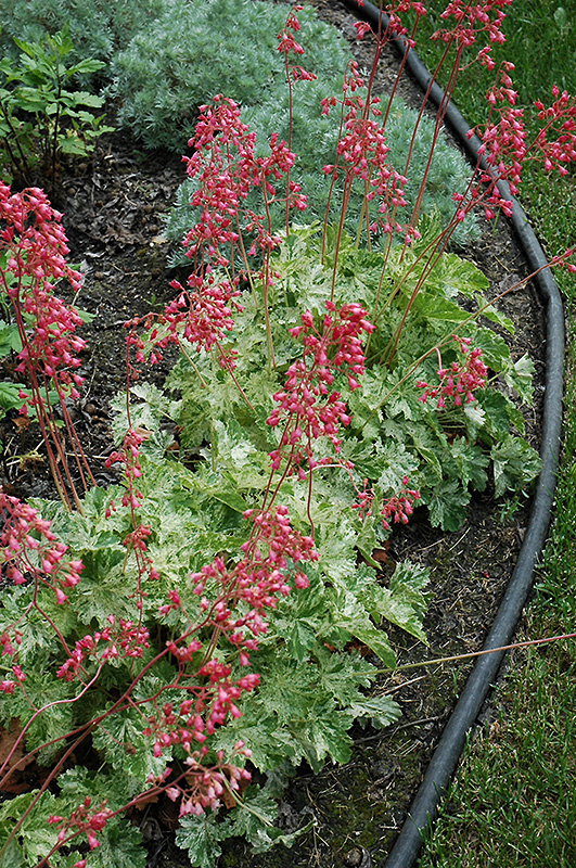 Hardiness Zone: 3 Other Names: Snow Storm Coralbells, Alumroot Description: This selection has large cherry pink flowers that rise above interesting green and white variegated leaves; great for cutting; an excellent choice for border edging, rock gardens or containers; protect from hot afternoon sun in warm regions Ornamental Features Snow Angel Coral Bells features dainty spikes of ruby-red bell-shaped flowers rising above the foliage from late spring to mid summer, which emerge from distinctive dark red flower buds. Its attractive crinkled lobed leaves remain green in color with showy white variegation throughout the year. Landscape Attributes Snow Angel Coral Bells is a dense herbaceous evergreen perennial with tall flower stalks held atop a low mound of foliage. Its relatively fine texture sets it apart from other garden plants with less refined foliage. This is a relatively low maintenance plant, and should be cut back in late fall in preparation for winter. It is a good choice for attracting hummingbirds to your yard. It has no significant negative characteristics. Snow Angel Coral Bells is recommended for the following landscape applications; Planting & Growing Snow Angel Coral Bells will grow to be about 8 inches tall at maturity extending to 18 inches tall with the flowers, with a spread of 12 inches. When grown in masses or used as a bedding plant, individual plants should be spaced approximately 10 inches apart. Its foliage tends to remain low and dense right to the ground. It grows at a medium rate, and under ideal conditions can be expected to live for approximately 10 years. As an evegreen perennial, this plant will typically keep its form and foliage year-round. This plant performs well in both full sun and full shade. However, you may want to keep it away from hot, dry locations that receive direct afternoon sun or which get reflected sunlight, such as against the south side of a white wall. It prefers to grow in average to moist conditions, and shouldn't be allowed to dry out. It is not particular as to soil type or pH. It is somewhat tolerant of urban pollution. Consider covering it with a thick layer of mulch in winter to protect it in exposed locations or colder microclimates. This is a selection of a native North American species. It can be propagated by division; however, as a cultivated variety, be aware that it may be subject to certain restrictions or prohibitions on propagation. Snow Angel Coral Bells is a fine choice for the garden, but it is also a good selection for planting in outdoor pots and containers. It is often used as a 'filler' in the 'spiller-thriller-filler' container combination, providing a mass of flowers and foliage against which the larger thriller plants stand out. Note that when growing plants in outdoor containers and baskets, they may require more frequent waterings than they would in the yard or garden.![]()