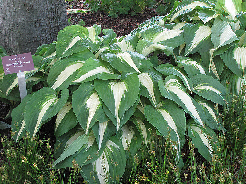 Hardiness Zone: 2 Other Names: Plantain Lily, Funkia Description: An eye-catching medium to large sized variety featuring mounds of thick, dark green foliage with striking creamy white centers which progress to bright white by midsummer; pale lavender flowers appear on tall scapes in mid to late summer; low maintenance Ornamental Features Night Before Christmas Hosta features dainty spikes of lavender tubular flowers rising above the foliage in mid summer. Its attractive large textured pointy leaves remain white in color with showy dark green variegation throughout the season. Landscape Attributes Night Before Christmas Hosta is a dense herbaceous perennial with tall flower stalks held atop a low mound of foliage. Its medium texture blends into the garden, but can always be balanced by a couple of finer or coarser plants for an effective composition. This is a relatively low maintenance plant, and is best cleaned up in early spring before it resumes active growth for the season. Gardeners should be aware of the following characteristic(s) that may warrant special consideration; Night Before Christmas Hosta is recommended for the following landscape applications; Planting & Growing Night Before Christmas Hosta will grow to be about 18 inches tall at maturity extending to 28 inches tall with the flowers, with a spread of 4 feet. When grown in masses or used as a bedding plant, individual plants should be spaced approximately 4 feet apart. Its foliage tends to remain dense right to the ground, not requiring facer plants in front. It grows at a medium rate, and under ideal conditions can be expected to live for approximately 10 years. As an herbaceous perennial, this plant will usually die back to the crown each winter, and will regrow from the base each spring. Be careful not to disturb the crown in late winter when it may not be readily seen! This plant does best in partial shade to shade. It prefers to grow in average to moist conditions, and shouldn't be allowed to dry out. It is not particular as to soil type or pH. It is somewhat tolerant of urban pollution. This particular variety is an interspecific hybrid. It can be propagated by division; however, as a cultivated variety, be aware that it may be subject to certain restrictions or prohibitions on propagation.![]()